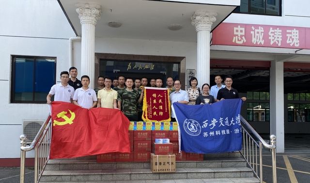 ??? 科技園黨支部代表研究院和科技園為汾湖消防中隊送去了生活用品和防暑降溫飲品等慰問品,衷心感謝他們長期以來為國家、社會和人民群眾生命財產安全做出的積極貢獻,向炎炎夏日仍堅守在一線崗位的消防隊員們送去絲絲清涼。