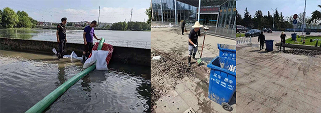 7月28日隨著降雨量的不斷增加,外圍湖泊水位的快速上漲,創客空間地面低于外圍湖泊的水平面,出現湖水倒灌現象,創客空間外部道路全部被洪水淹沒,積水最深處達0.5米,部分一樓辦公室進水。面對來勢洶洶的洪水,王剛帶領汾湖科技園黨支部黨員和物業公司立刻成立防汛小組,迅速投入到抗擊洪水的戰役中去。防汛小組兵分三組:一組組織防汛物資堵住通往外圍湖泊的雨水管網,堵住湖水倒灌;二組開啟大功率水泵,開始往外排水;三組用防汛沙袋鋪設臨時道路,方便創客空間內人員出入。經過一天一夜的排水,創客空間內積水于7月30日凌晨全部排完。積水退去后,支部黨員迅速開展道路清理和消毒工作,保證創客空間各項秩序恢復正常。