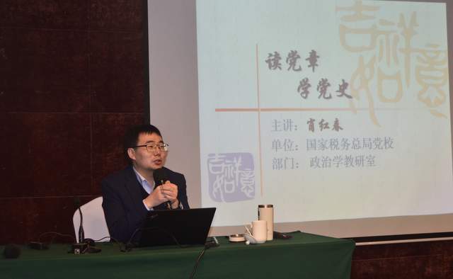 會議特邀了國家稅務總局黨校政治學教研室副主任、中國人民大學哲學博士肖紅春副教授做報告。報告會上,肖紅春做了題為“讀黨章 學黨史”的專題報告,他以風趣幽默的語言,深入淺出、生動形象的講述了中國共產黨的百年發展歷史,并講述了自“一大”以來歷次黨章修訂的背景及主要內容等。