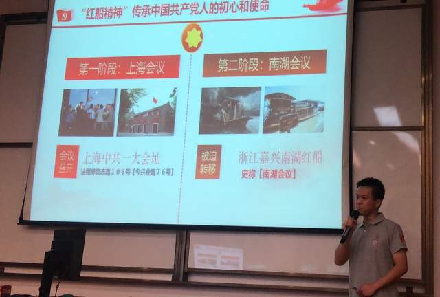 馬克思主義學院研究生張龍同學首先從共產黨成立的歷史講起:共產黨成立到現在,中國發展的每一個歷史性關頭,都散發著共產黨紅船精神的偉大光芒,紅船精神是一種開天辟地,敢為人先的首創精神,是堅定理想,百折不撓的奮斗精神,是立黨為公,忠誠為民的奉獻精神。結合當下,我們要不忘初心,走好新時代長征路。