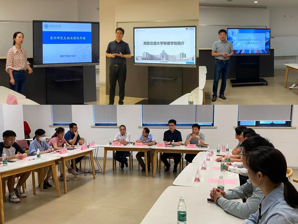 物理學院院長助理孔春才副教授首先介紹了學院及研究院的發展概況,希望通過此次學習交流尋找更多合作機會。王超鋒分別從教育生態圈、人才生態圈和科技生態圈三方面詳細介紹了蘇州研究院的發展歷程,他希望學校能有更多專家、教授團隊到蘇州與當地政府、企業、科研機構合作,深化產教融合、科教融匯、校企協同,共同推進產教融合協同育人創新聯合體建設。吳駿剛簡要介紹了蘇州基地發展概況以及蘇州的歷史文化和人文環境。他寄語在座的各位同學要走出來,多接觸先進地區、先進文化以及先進產業,開拓思路,大膽嘗試,努力成為新時代優秀青年。產教融合協同育人基地(蘇州)研究生輔導員楊晶介紹了蘇州研究生的整體情況、創新創業及學生活動等。