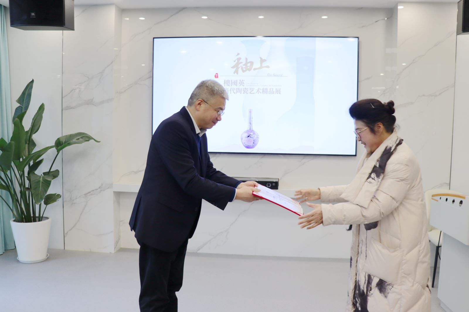 ? ? ? ?隨后,中國陶瓷藝術設計大師樓國英向西安交通大學蘇州研究院贈與作品,張劍鋒副院長代表西安交通大學蘇州研究院向樓國英教授頒發(fā)客座教授聘書。各位領導嘉賓隨后一同來到展覽現(xiàn)場,由策展人為各位領導嘉賓導覽。