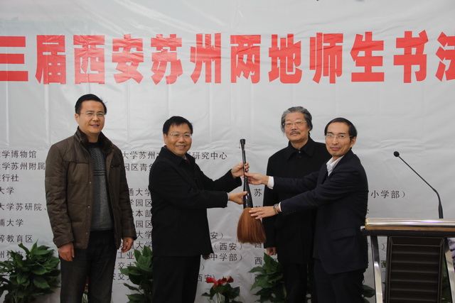 2014年12月30日上午,由我院和西安交通大學博物館聯合主辦的西安蘇州兩地書法大賽——第三屆西安蘇州兩地師生書法大賽頒獎典禮在蘇州青劍湖學校順利舉行。中國書協顧問西安交大博士生導師鐘明善教授,西交大蘇州研究院吳軍華常務副院長、余海葒副院長,中國書法家協會培訓中心葛鴻楨教授、市書協副主席兼教育委員會主任陳藝,園區教育局林紅梅副局長、高靜波處長,獨墅湖科教創新區余亦麟,園區書協錢玉清主席等以及西交大附屬中小學、園區參賽學校,獲獎選手及部分家長代表參與了此次頒獎儀式。