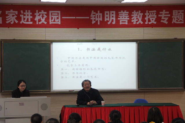 隨后,與會嘉賓參觀了青劍湖學校,及示范課程。鐘明善教授還為學校教師及部分愛好書法的學生作了一場名為《書法與書法學習》的專題講座,鐘老底蘊深厚,講學深入淺出,盡顯大家風范。他對書法求真、唯美的藝術追求以及從書法談做人的哲學思辨深深地感染了每一位聽眾。