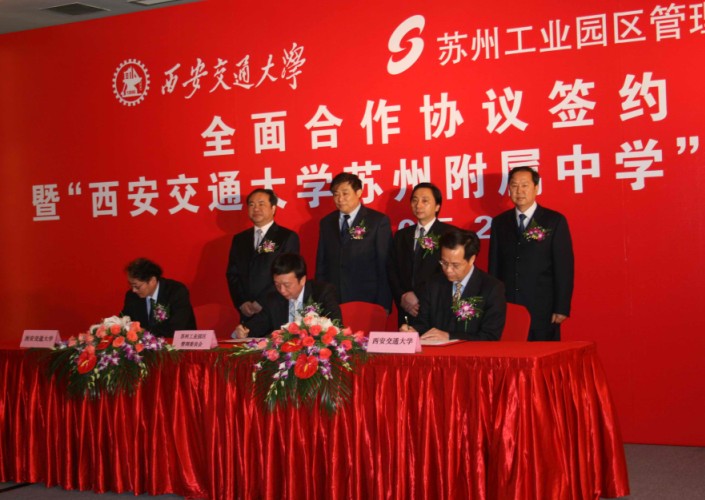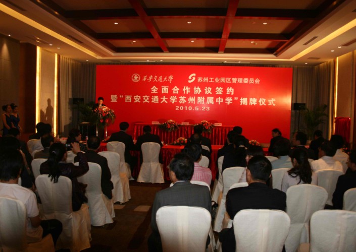 春風和煦,百花盛開。2010年5月23日,在這生機盎然的時節,西安交通大學與蘇州工業園區管委會全面合作協議簽約暨“西安交通大學蘇州附屬中學”揭牌儀式,在蘇州工業園區月亮灣國際會議中心隆重舉行。這是西安交大與蘇州工業園區開展產學研全面合作的又一里程碑。