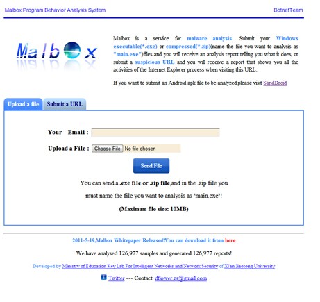????????本實驗室開發(fā)的惡意代碼分析系統(tǒng)Malbox系統(tǒng)已在全球發(fā)布,每天都收到來自全球各地的訪問,日訪問量最高達1143人次。Malbox能夠快速地對用戶提交的可疑目標程序進行自動分析,從而識別僵尸木馬、木馬下載器等惡意行為特征;另外,對用戶提交的任意可疑URL,Malbox可分析訪問該URL時可能產(chǎn)生的惡意行為。詳盡明確的分析報告將通過電子郵件向用戶發(fā)送,提示可能存在的網(wǎng)絡風險,幫助用戶更安全可靠地使用網(wǎng)絡。