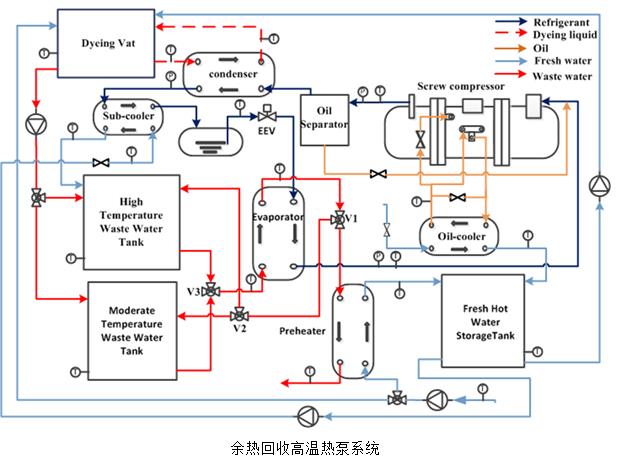 ????????合理利用各種余熱回收技術(shù)來產(chǎn)生高品位的熱量以滿足工業(yè)生產(chǎn)用熱的需求已經(jīng)成為現(xiàn)在各國廣泛研究與應(yīng)用的一項(xiàng)新技術(shù)領(lǐng)域,余熱回收技術(shù)的核心是能量的轉(zhuǎn)移,目前采用的方式有很多種,最有效的方式便是熱泵裝置。熱泵是以消耗一定的高質(zhì)能(機(jī)械能、電能、熱能)為代價(jià),通過熱力循環(huán),把熱能由低溫物體轉(zhuǎn)移到高溫物體的能量利用系統(tǒng)。高溫水源熱泵是高溫?zé)岜玫囊活悾酶黝惞I(yè)廢水(40℃以上)中的余熱來制取70~98℃的高溫?zé)崴軌蛑苯佑糜诠┡⑵胀üI(yè)加熱以及烘干。