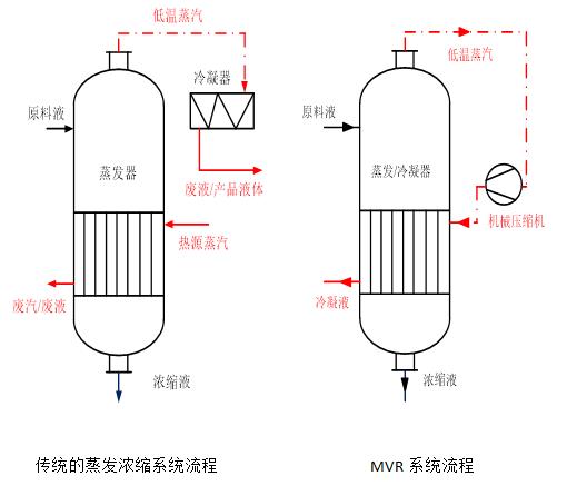 ????????MVR(mechanical vapor recompression)為機(jī)械蒸汽再壓縮的簡稱,是利用水蒸汽壓縮機(jī)將系統(tǒng)中的水蒸汽壓縮升溫以產(chǎn)生二次高溫蒸汽,從而減少對外界能源需求的一項(xiàng)技術(shù)。其工作過程是低溫位的蒸汽經(jīng)壓縮機(jī)壓縮,溫度、壓力提高,熱焓增加,然后進(jìn)入換熱器冷凝,以充分利用蒸汽的潛熱。除開車啟動外,整個蒸發(fā)過程中無需生蒸汽。水蒸汽壓縮機(jī)是整個MVR系統(tǒng)的最核心部件。雙螺桿壓縮機(jī)屬于容積式壓縮機(jī),依靠一對相互嚙合的螺旋轉(zhuǎn)子完成壓縮機(jī)吸汽、壓縮及排汽過程,具有性能穩(wěn)定、可靠性高、對工作介質(zhì)適應(yīng)性強(qiáng)、可多相混輸?shù)忍攸c(diǎn)。雙螺桿壓縮機(jī)能夠?qū)崿F(xiàn)濕壓縮,在高壓比條件下,通過向處于內(nèi)壓縮過程的工作腔內(nèi)噴液冷卻來控制排汽溫度,使得蒸汽壓縮機(jī)在各運(yùn)行工況下的排汽溫度,均為排汽壓力對應(yīng)的飽和溫度,比羅茨鼓風(fēng)機(jī)、離心壓縮機(jī)適用工況范圍寬廣得多。在內(nèi)壓縮過程中噴入壓縮介質(zhì)的液體,不但能有效降低排汽溫度,噴入的液體也成為了飽和蒸汽,從而提高了MVR系統(tǒng)的蒸汽產(chǎn)量。此外,雙螺桿壓縮機(jī)變工況適應(yīng)能力強(qiáng),容量調(diào)節(jié)方式多樣化,通過合適的轉(zhuǎn)子選材和合理的密封結(jié)構(gòu)設(shè)計(jì),可以實(shí)現(xiàn)諸多蒸汽介質(zhì)(例如甲醇、水蒸汽等)的壓縮,制造加工成本也比離心機(jī)低,是最理想的MVR水蒸汽壓縮機(jī)結(jié)構(gòu)型式。