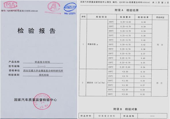 ????????應用:可廣泛用于各種交通運輸工具和機器設備的制動器、離合器及摩擦傳動裝置。下圖為摩擦系數和磨損率的檢測報告。