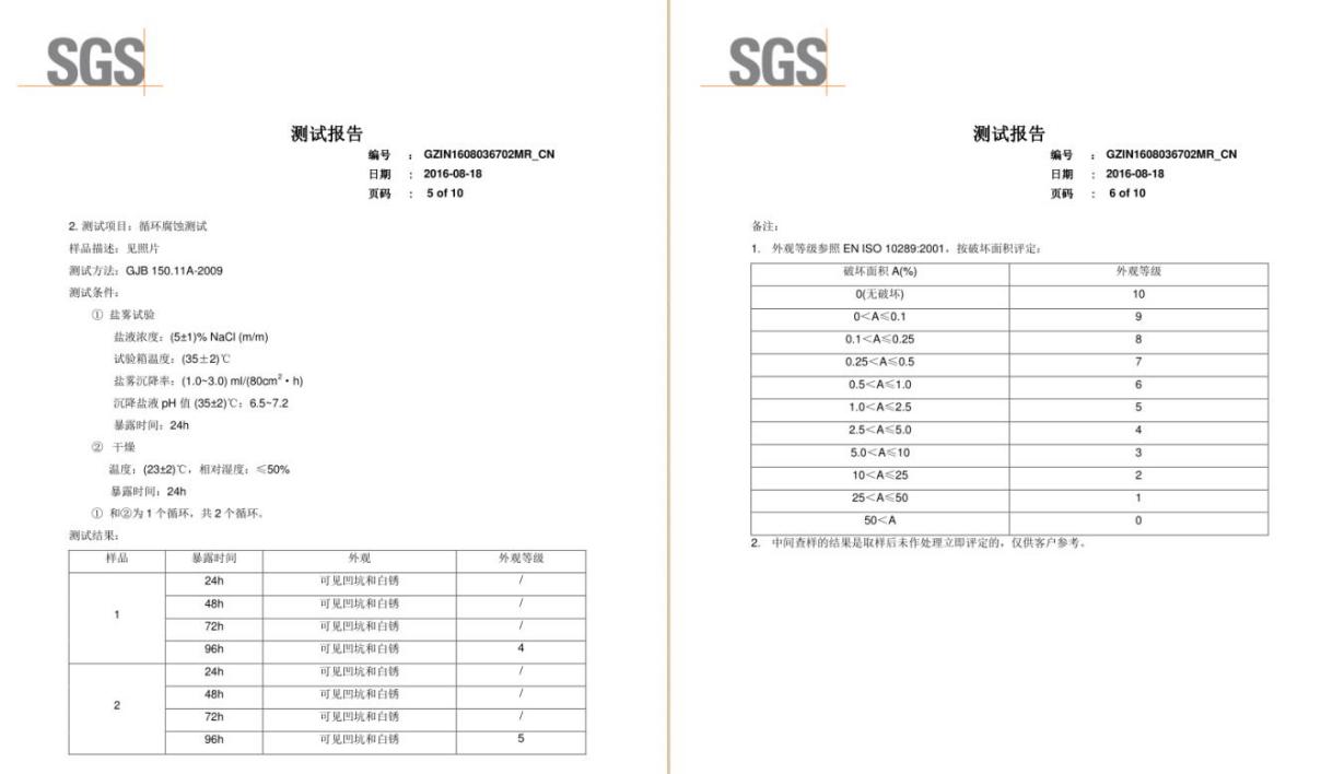 ????????性能:循環鹽霧實驗96h,破損面積小于5%(已經過SGS驗證,如圖1);處理后表面不導電;